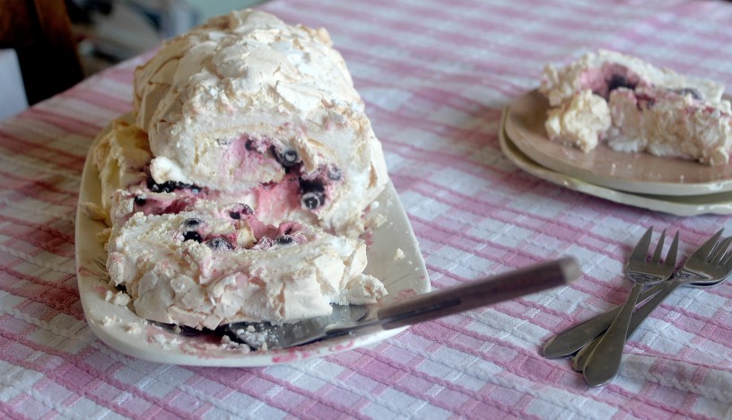 2) Spoon the cream mix on to the cooled meringue and spread it all over, top with your choice of berries and then roll from the short end to create a log – use the baking paper to help you along, it can be a little bit tricky to roll but it looks great when it’s done!